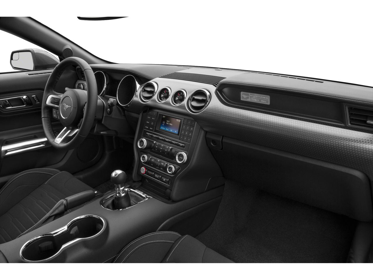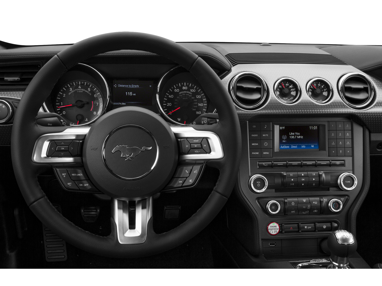 * Bluetooth®/Handsfree Calling *, * USB Adapter *, Mustang GT, 2D Coupe, 5.0L V8 Ti-VCT, 6-Speed Manual, RWD, Black, Ebony Cloth, Equipment Group 300A, 4-Wheel Disc Brakes, 6 Speakers, ABS brakes, Air Conditioning, Alloy wheels, AM/FM radio, Auto-dimming Rear-View mirror, Block heater, Brake assist, Bumpers: body-color, CD player, Cloth Sport Bucket Seats, Compass, Delay-off headlights, Driver door bin, Driver vanity mirror, Dual front impact airbags, Dual front side impact airbags, Electronic Stability Control, Exterior Parking Camera Rear, Four wheel independent suspension, Front anti-roll bar, Front Bucket Seats, Front Center Armrest, Front fog lights, Front reading lights, Fully automatic headlights, High-Intensity Discharge Headlights, Illuminated entry, Knee airbag, Low tire pressure warning, Occupant sensing airbag, Outside temperature display, Overhead airbag, Panic alarm, Passenger door bin, Passenger vanity mirror, Power door mirrors, Power driver seat, Power passenger seat, Power steering, Power windows, Premium AM/FM Stereo w/Single CD Player, Radio data system, Rear anti-roll bar, Rear window defroster, Remote keyless entry, Reverse Park Assist, Security system, Speed control, Speed-sensing steering, Speed-Sensitive Wipers, Split folding rear seat, Spoiler, Steering wheel mounted audio controls, SYNC Communications & Entertainment System, Tachometer, Telescoping steering wheel, Tilt steering wheel, Traction control, Trip computer, Variably intermittent wipers, Voltmeter, Wheels: 18 x 8 Magnetic Painted/Machined, Mustang GT, 2D Coupe, 5.0L V8 Ti-VCT, 6-Speed Manual, RWD, Black, Ebony Cloth, Equipment Group 300A.